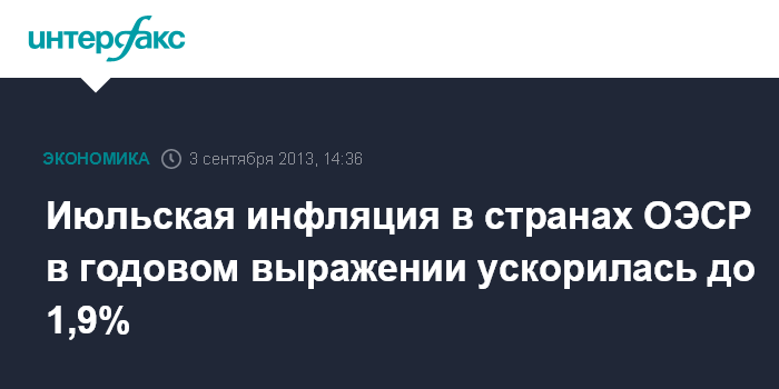 3 сентября. FINMARKET.RU - В июле 2013 г. средняя инфляция в странах, входящих в Организацию экономического сотрудничества и развития (ОЭСР), ускорилась до 1,9% в годовом исчислении против 1,8% в июне и 1,5% в мае, говорится в сообщении организации.
