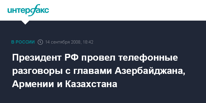Москва.14 сентября. INTERFAX.RU - Президент России Дмитрий Медведев в воскресенье провел телефонные разговоры с президентами Азербайджана, Армении и Казахстана Ильхамом Алиевым, Сержем Саргсяном и Нурсултаном Назарбаевым, сообщили "Интерфаксу" в пресс-службе Кремля.