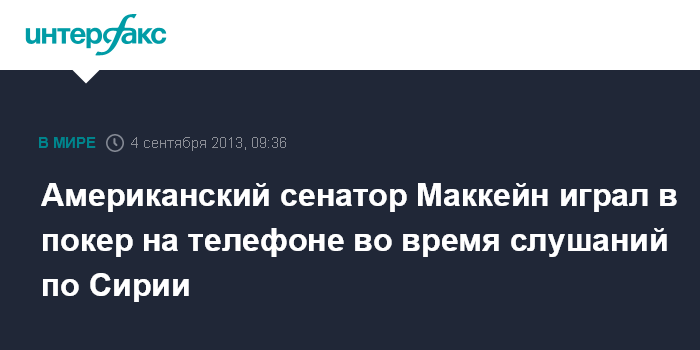 Вашингтон. 4 сентября. INTERFAX.RU - Фотограф американской газеты Washington Post запечатлел, как влиятельный сенатор-республиканец Джон Маккейн играл в покер на мобильном телефоне в ходе обсуждения возможного удара по Сирии в комитете сената США по международным делам, сообщает в среду телеканал CNN.