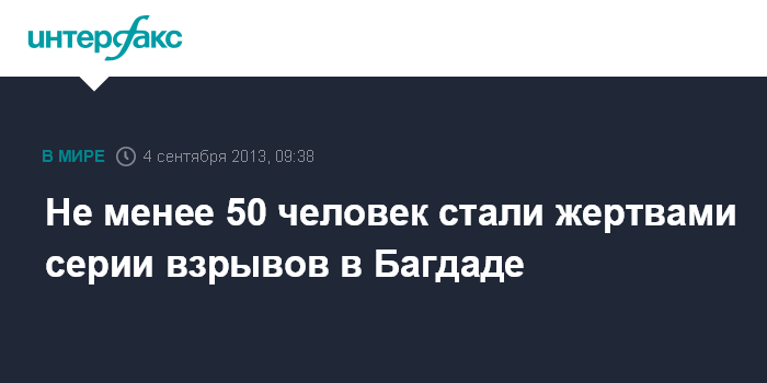 Багдад. 4 сентября. INTERFAX.RU - По меньшей мере, 50 человек погибли и еще около 100 получили ранения в результате серии взрывов, прогремевших в столице Ирака Багдаде, сообщают врачи и представители местной полиции.