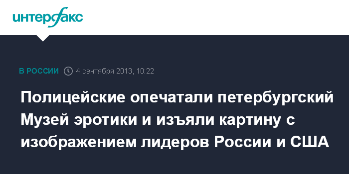 Санкт-Петербург. 4 сентября. INTERFAX.RU - Сотрудники правоохранительных органов опечатали во вторник петербургский Музей эротики "Точка G", сообщил "Интерфаксу" в среду его куратор Александр Донской. По его словам, музей был опечатан по заявлению депутата Милонова. В ходе проверки была изъята картина с изображением Путина и Обамы "Противостояние России и Америки".