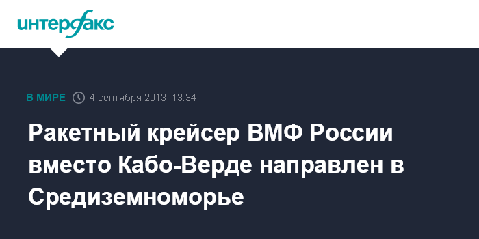 Москва. 4 сентября. INTERFAX.RU- Ракетный крейсер Черноморского флота "Москва", прозванный в НАТО "убийцей авианосцев", вместо запланированного ранее захода в порт Минделу (Кабо-Верде) направляется в Восточное Средиземноморье.