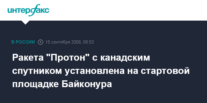 Байконур. 15 сентября. INTERFAX.RU - Ракета-носитель "Протон-М" с канадским телекоммуникационным космическим аппаратом Nimiq 4 в понедельник установлена на стартовой площадке Байконура.