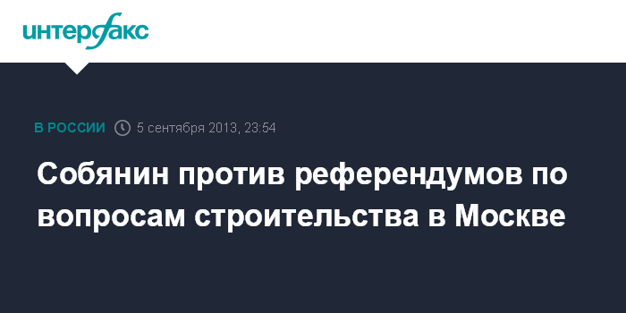 Москва. 5 сентября. INTERFAX.RU - Вопросы строительства в Москве не должны решаться с помощью референдумов, сообщил в четверг кандидат на пост мэра Москвы Сергей Собянин. "Еще одна идея (политических оппонентов) - это любой вопрос - строительство дороги, развязки, станций метро, поликлиники - решать на референдумах. Вы знаете, если мы все это решали на референдумах, я вам точно гарантирую, что ни одного столба мы бы не вбили, ни одного километра дороги мы бы не построили", - сказал Собянин.