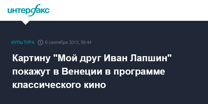 Венеция. 6 сентября. INTERFAX.RU - Отреставрированная версия фильма Алексея Германа "Мой друг Иван Лапшин" будет показана в пятницу на 70-ом Венецианском кинофестивале, передает корреспондент "Интерфакса".