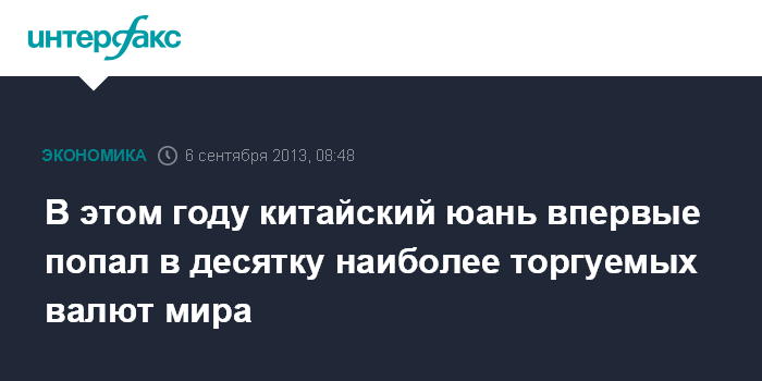 6 сентября. FINMARKET.RU - В 2013 году китайская нацвалюта - юань - впервые вошел в десятку наиболее торгуемых мировых валют, свидетельствуют данные Банка международных расчетов (Bank for International Settlements, BIS), пишет The Wall Street Journal.
