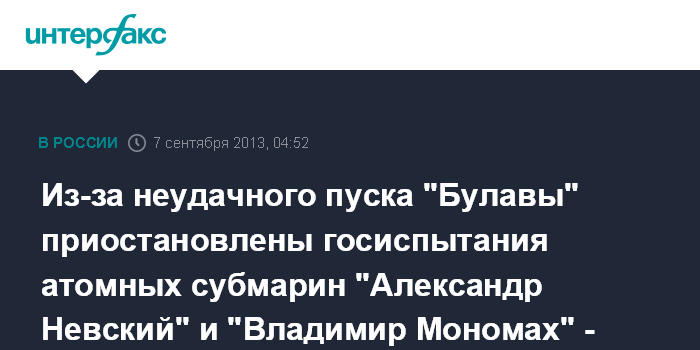 По его словам, С.Шойгу принял решение "о приостановке государственных испытаний АПЛ "Александр Невский" и "Владимир Мономах" и проведении пяти дополнительных практических пусков ракеты "Булава" с целью подтверждения ее заданных тактико-технических параметров".