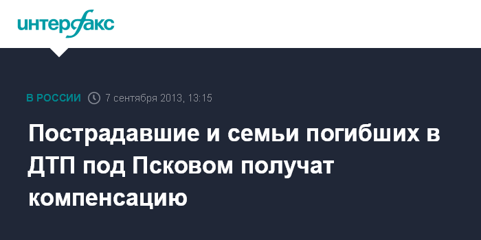 Псков. 7 сентября. INTERFAX.RU - Пострадавшим и семьям погибших в ДТП на трассе М-9 в Пустошкинском районе будет выплачена компенсация.