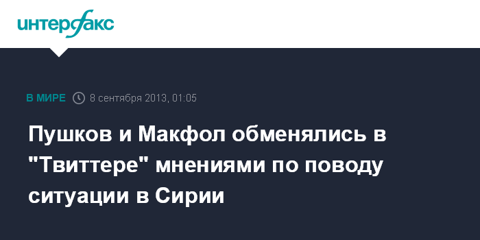 Москва. 8 сентября. ИНТЕРФАКС - Член комитета по международным делам Госдумы Алексей Пушков и посол США в РФ Майкл Макфол вступили в дискуссию на страничках своих микроблогов в "Твиттере" по поводу военного вторжения в Сирию.