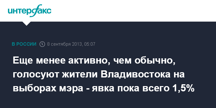 Владивосток. 8 сентября. ИНТЕРФАКС - ДАЛЬНИЙ ВОСТОК - За первые два часа голосования на выборах мэра Владивостока на участки пришло всего около 1,5% избирателей.