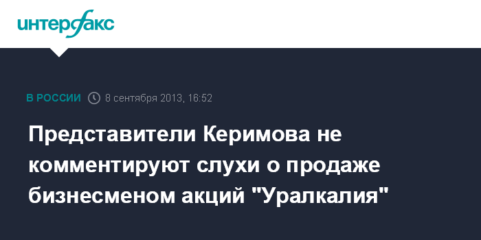 Москва. 8 сентября. INTERFAX.RU - Представитель компании "Нафта Москва" Сулеймана Керимова не стал комментировать информацию о продаже бизнесменом акций ОАО "Уралкалий".