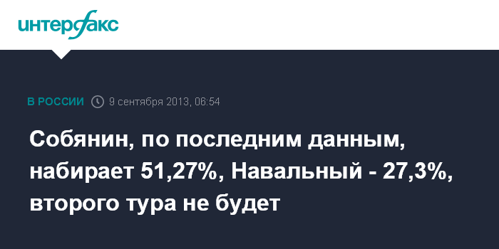 Собянин, по последним данным, набирает 51,27%, Навальный - 27,3%, второго тура не будет