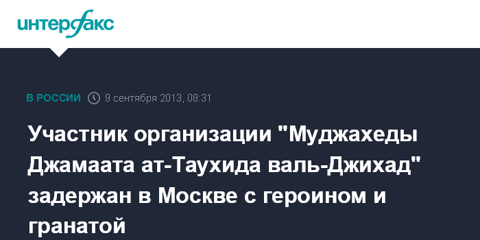 Участник организации "Муджахеды Джамаата ат-Таухида валь-Джихад" задержан в Москве с героином и гранатой