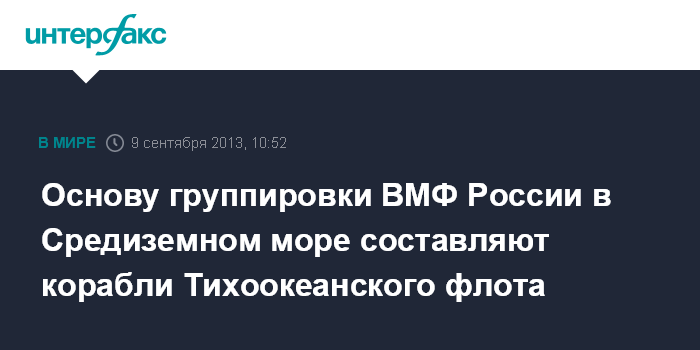 Владивосток. 9 сентября. INTERFAX.RU - Корабли Тихоокеанского флота представляют основу группировки ВМФ в Средиземном море и находятся там дольше всех, сообщил "Интерфаксу" в понедельник начальник отдела информационного обеспечения ТОФ капитан 1 ранга Роман Мартов.
