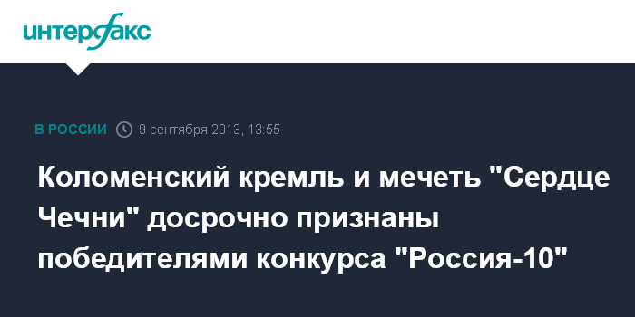 Москва. 9 сентября. INTERFAX.RU - Оргкомитет конкурса "Россия-10" признал ситуацию с голосованием форс-мажорной и досрочно объявил о победе в соревновании грозненской мечети "Сердце Чечни" и Коломенского кремля.