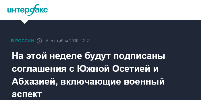 Москва. 15 сентября. INTERFAX.RU – Президент РФ Дмитрий Медведев заявляет о том, что на этой неделе подпишет специальные соглашения о дружбе и сотрудничестве с Южной Осетией и Абхазией, которые будут включать также и военную компоненту.
