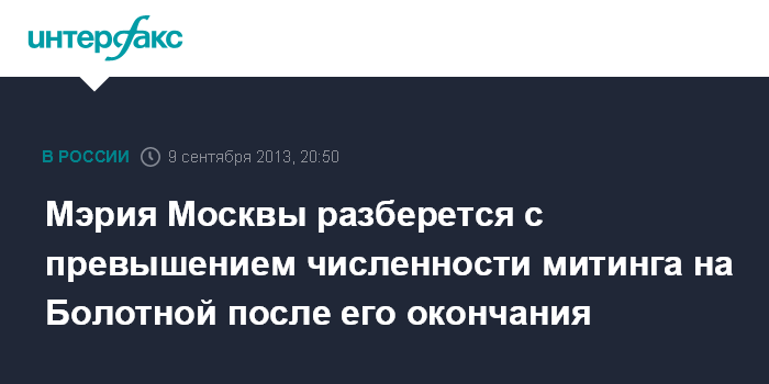 Москва. 9 сентября. INTERFAX.RU - Власти Москвы собираются позднее провести разбирательство в связи с несоблюдением оговоренной в заявке численности участников митинга, который в понедельник вечером на Болотной площади проводят сторонники оппозиционера Алексея Навального.