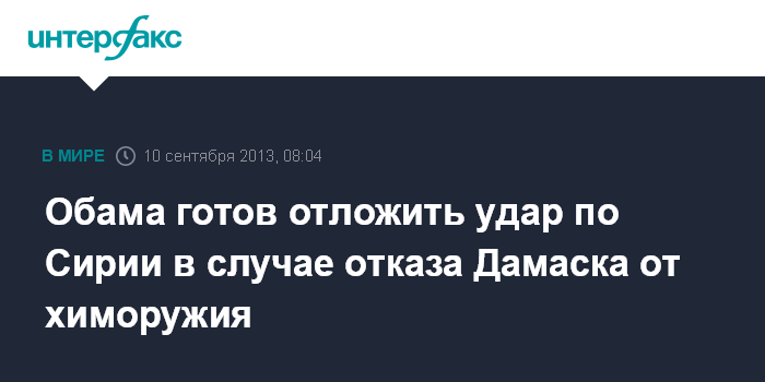 Москва. 10 сентября. INTERFAX.RU - Президент США Барак Обама заявил, что может отложить нанесение ударов по Сирии, если Дамаск, следуя предложению российской стороны, передаст химическое оружие под международный контроль.