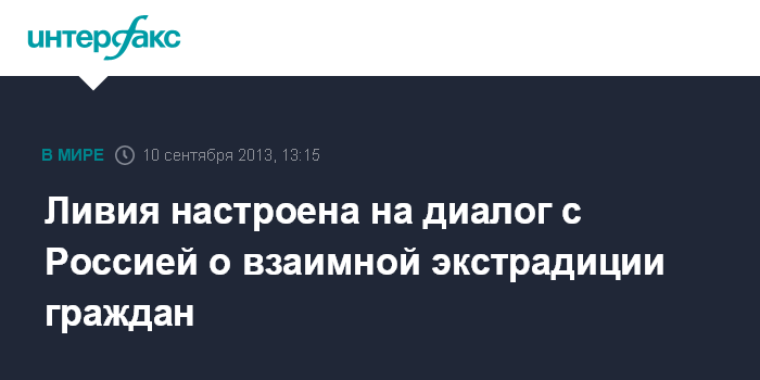 Москва. 10 сентября. INTERFAX.RU - Триполи готов к сотрудничеству с Россией в вопросах взаимной экстрадиции граждан, заявил глава МИД Ливии Мухаммад Абдель-Азиз.