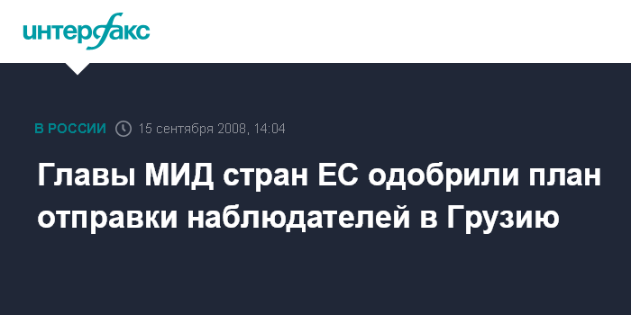 Москва. 15 сентября. INTERFAX.RU - Министры иностранных дел стран Европейского Союза дали в понедельник согласие на отправку наблюдателей в Грузию, сообщают дипломаты ЕС.На заседании в Брюсселе министры одобрили план по "совместным действиям", являющийся юридической основой для дальнейшей работы наблюдателей.