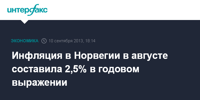 10 сентября. FINMARKET.RU - Инфляция в Норвегии в августе 2013 года в пересчете на годовые темпы, с учетом налогов и цен на энергоносители, в августе составила 2,5%, сообщило статистическое агентство страны. Аналитики, опрошенные агентством Bloomberg, в среднем ожидали этот показатель на уровне 1,9%.