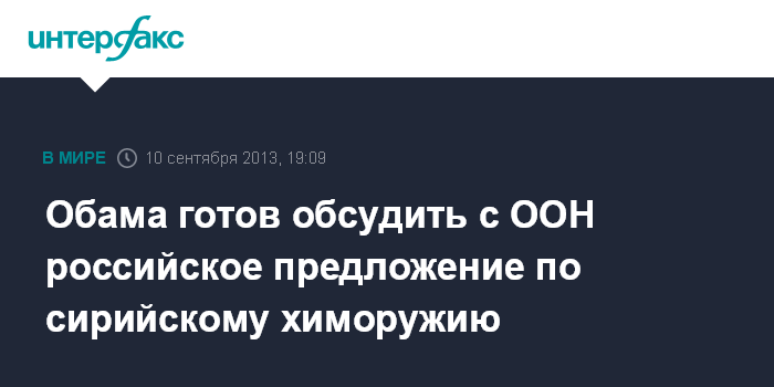 Вашингтон. 10 сентября. INTERFAX.RU - Президент США Барак Обама согласился на то, чтобы провести в ООН обсуждение российского предложения по проблеме сирийского химоружия, сообщает во вторник агентство АП со ссылкой на знакомые с ситуацией источники.