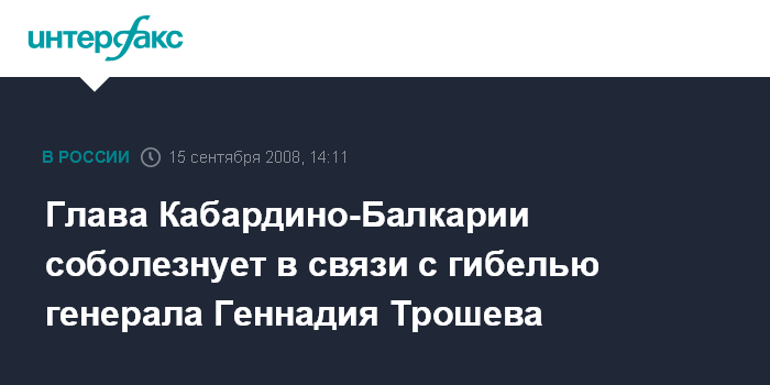 Москва. 15 сентября. NTERFAX.RU - Президент Кабардино-Балкарии Арсен Каноков выразил соболезнование родным и близким Героя России генерал-полковника Геннадия Трошева, трагически погибшего в авиакатастрофе в Перми.