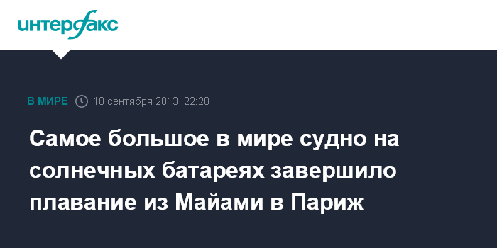 Париж. 10 сентября. INTERFAX.RU - Самое большое в мире судно, работающее на солнечных батареях, завершило трехмесячное путешествие через Атлантический океан и прибыло во вторник в Париж, сообщают французские СМИ.