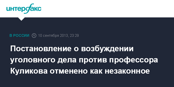Постановление о возбуждении уголовного дела против профессора Куликова отменено как незаконное