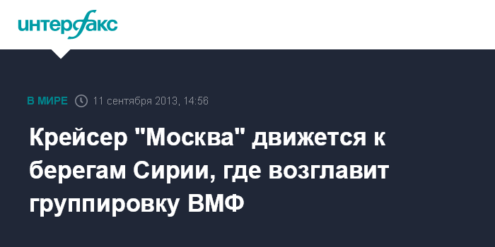 По его словам, 15-16 сентября крейсер "Москва" прибудет в назначенный район восточного Средиземноморья. Там он примет на борт штаб оперативного соединения ВМФ, который сейчас находится на большом противолодочном корабле "Адмирал Пантелеев".