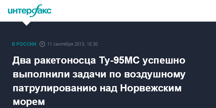 Москва. 11 сентября. INTERFAX.RU - Два стратегических бомбардировщика Ту-95МС успешно выполнили задачи по плану воздушного патрулирования, сообщил в среду "Интерфаксу-АВН" официальный представитель ВВС полковник Игорь Климов.