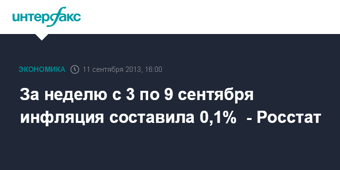 11 сентября. FINMARKET.RU - За период с 3 по 9 сентября 2013 года потребительские цены в России выросли на 0,1%, сообщает Федеральная служба госстатистики (Росстат). С начала сентября инфляция составила 0,1%, с начала года - 4,6%.