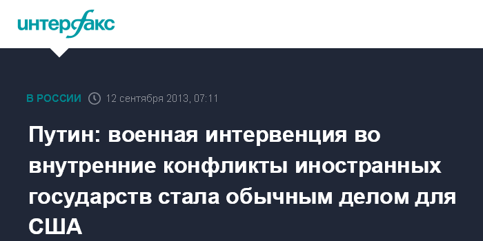 Москва/Вашингтон. 12 сентября. ИНТЕРФАКС - Российский лидер Владимир Путин обеспокоен тем, что военное вмешательство во внутренние конфликты иностранных государств стало обычным явлением для США.