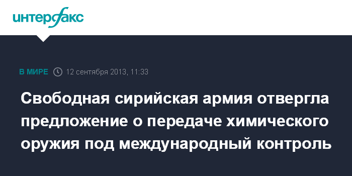 Дубай. 12 сентября. INTERFAX.RU - Бойцы Свободной сирийской армии (ССА) категорически отказываются от предложения России о передаче Сирией химического оружия под международный контроль, заявил глава генштаба оппозиционной ССА генерал Селим Идрисс.