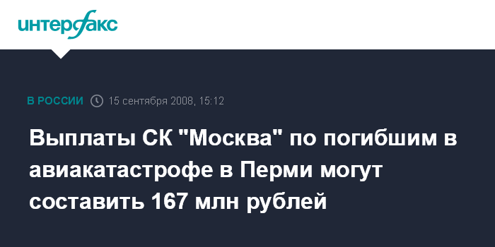 Москва. 15 сентября. INTERFAX.RU – Все риски по разбившемуся в Перми самолету застрахованы в страховой компании "Москва", выплаты по погибшим 82 пассажирам и 6 членам экипажа могут составить 167 млн рублей.