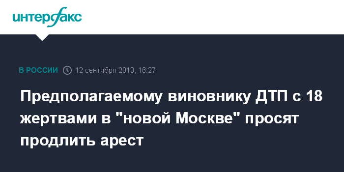 Москва. 12 сентября. INTERFAX.RU - Следствие вышло с ходатайством о продлении срока содержания под стражей предполагаемому виновнику ДТП в "новой Москве", где в результате столкновения "КамАЗа" и автобуса погибли 18 человек, сообщили "Интерфаксу" в пресс-службе ГУ МВД России по Москве.