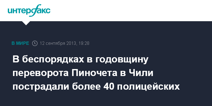 Сантьяго. 12 сентября. INTERFAX.RU - 42 полицейских получили ранения в результате столкновений с протестующими в пригородах столицы Чили Сантьяго в день 40-й годовщины военного переворота, организованного генералом Аугусто Пиночетом, заявили в четверг в чилийском МВД.