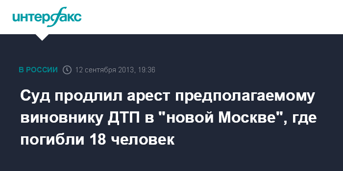 Москва. 12 сентября. INTERFAX.RU - Суд продлил до 14 декабря срок содержания под стражей гражданина Армении Грачии Арутюняна, обвиняемого в совершении ДТП в "новой Москве", унесшем жизни 18 человек, сообщили "Интерфаксу" в ГУ МВД России по Москве в четверг.