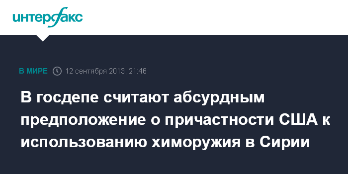 Вашингтон. 12 сентября. INTERFAX.RU - Предположения о том, что Вашингтон может быть причастен к использованию химоружия под Дамаском, совершенно абсурдны, заявила в четверг представитель госдепа США Мари Харф.