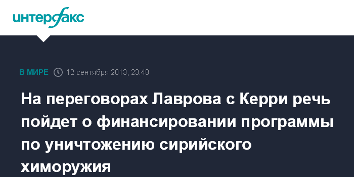 Женева. 12 сентября. INTERFAX.RU - На переговорах глав внешнеполитических ведомств России и США в Женеве по реализации плана по установлению под международный контроль сирийского химического оружия будет затронута финансовая сторона вопроса.