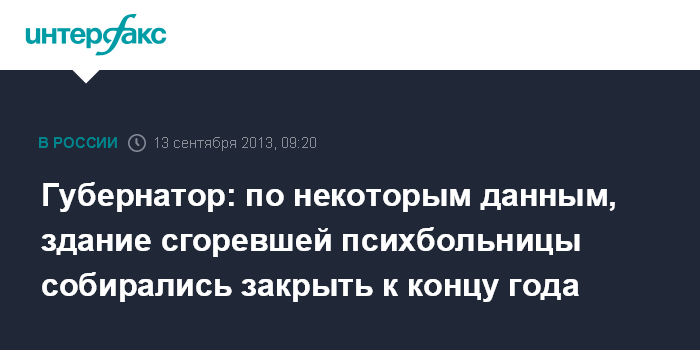 Москва. 13 сентября. INTERFAX.RU - Пациентов сгоревшего в Новгородской области корпуса психоневрологического интерната в конце этого года предполагалось перевести в другие места, сообщил губернатор Новгородской области Сергей Митин.