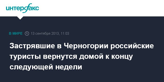 Москва. 13 сентября. INTERFAX.RU - Российские туристы, застрявшие в Черногории из-за конфликта между бывшим и нынешним руководством туроператора "ТТС Партнер" приедут домой к концу следующей недели.