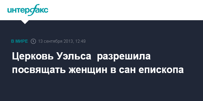 Лондон. 13 сентября. INTERFAX.RU - Англиканская церковь Уэльса путем голосования приняла историческое решение посвящать женщин в сан епископа, сообщает в пятницу британская газета Daily Telegraph.