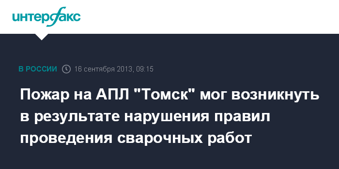 "Для выяснения обстоятельств и причин возгорания создана комиссия. По предварительным данным, причиной возгорания стало нарушение правил проведения сварочных работ", - говорится в сообщении, поступившем в "Интерфакс-АВН" в понедельник.
