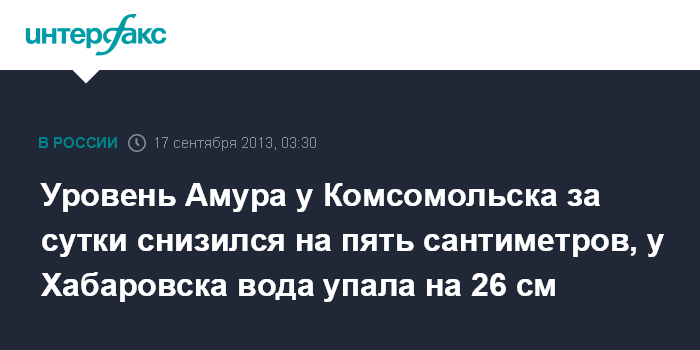 Хабаровск. 17 сентября. ИНТЕРФАКС - ДАЛЬНИЙ ВОСТОК - Река Амур в районе Комсомольска-на-Амуре по данным на 08:00 местного времени (01:00 мск) упала до отметки 904 см, уровень воды за сутки снизился на пять см, сообщает во вторник пресс-служба ГУ МЧС по региону.