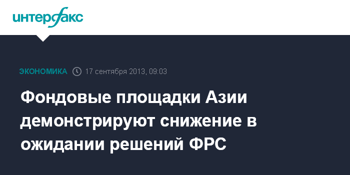 17 сентября. FINMARKET.RU - Фондовые индексы Азиатско-Тихоокеанского региона падают в ходе торгов во вторник с достигнутого накануне максимума за 4 месяца, поскольку инвесторы ожидают, что Федеральная резервная система (ФРС) в ближайшие дни примет решение о сворачивании стимулирующих программ, сообщает агентство Bloomberg.
