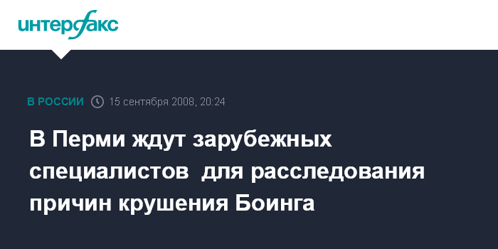 Пермь. 15 сентября. ИНТЕРФАКС-ПОВОЛЖЬЕ - В Пермь ожидается приезд зарубежных специалистов для расследования причин рушения Боинга, сообщил журналистам по итогам заседания правительственной комиссии глава Росаэронавигации Александр Нерадько.