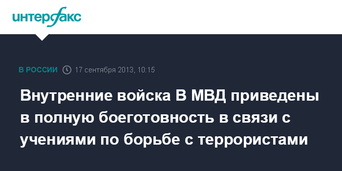 Москва. 17 сентября. INTERFAX.RU - Внутренние войска МВД России приводятся в полную боевую готовность в связи с учениями, сообщили "Интерфаксу" в пресс-центре МВД России.