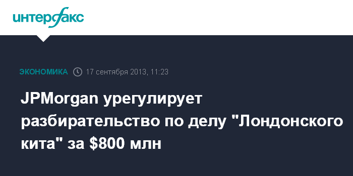 Лондон/Вашингтон. 17 сентября. INTERFAX.RU - Крупнейший банк США JPMorgan Chase & Co. согласится урегулировать в досудебном порядке дело сотрудника Бруно Мишеля Иксиля по прозвищу "Лондонский кит" (London Whale), выплатив штраф в размере не менее $800 млн и признав собственную вину, пишет газета The Wall Street Journal со ссылкой на информированные источники.