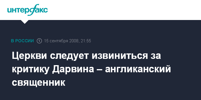 Лондон. 15 сентября. ИНТЕРФАКС - Церковь должна принести извинения за враждебную реакцию в отношении Чарльза Дарвина и его теории эволюции - такое мнение высказал в понедельник один из священнослужителей на англиканском веб-сайте.